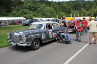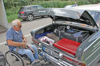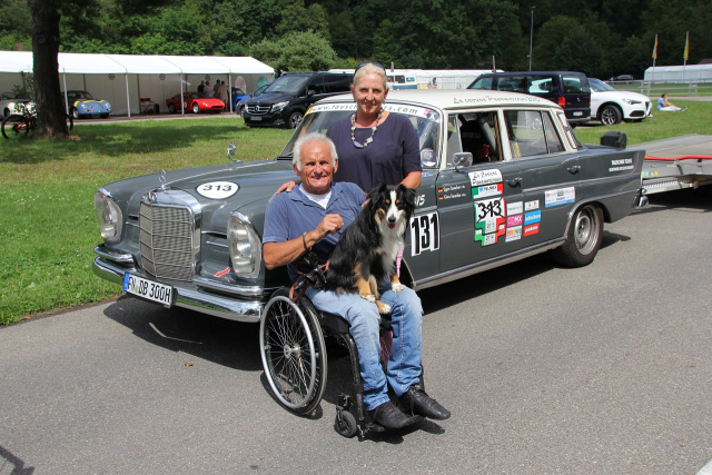 Im Schlepptau hatte der Oldtimer-Sammler einen Doppelachsanhänger, der noch länger als die Zugmaschine war. Darauf stand sein Alfa Romeo Corsa Spider 6 C 2500 S(uper) S(port) von 1939, den er vor vielen Jahren als Schrottpaket kaufte und mühevoll fünf Jahre lang restauriert hat. Einer von weltweit zwei existierenden. Die Türen vom Rallye Benz öffneten sich. Egon Tauschers Frau Gina holte den Rollstuhl aus dem Kofferraum in den sich Egon trotz der langen Anfahrt vom Bodensee sofort schwang, während Hündin Luna das Orga-Team der Rennveranstaltung begrüßte . Es glich einer perfekt einstudierten Choreografie, wie das Ehepaar die beiden Fahrzeuge trennte, abschnallte, ablud und parkte. Jeder wusste was zu tun war. Jeder Handgriff saß, ein tolles Team.