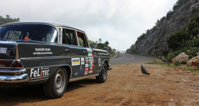 Die meisten Mercedes-Fans werden wohl von Karl Klings Teilnahme an der Carrera 1952 wissen. Damals prallte ein schwerer Geier mit dem heranrasenden Mercedes 300SL Flügeltürer zusammen. Der Vogel zerschmetterte die Windschutzscheibe und der Beifahrer Hans Klenk wurde verletzt. Kurzerhand wurde die Scheibe nach der Etappe ersetzt und mit Metallstreben vergittert, um so einer Begegnung der gefiederten Art für den weiteren Rennverlauf vorzubeugen. Trotz dieses Unfalls siegte Kling damals mit dem Mercedes. Bei diesem Rennen muss man also mit Allem rechnen. Egon Tauscher erinnert sich, dass er permanent auf der Hut war.