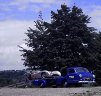 Da konnte es passieren, dass so en Käfer-Pilot im Rückspiegel plötzlich ein blaues Etwas registrierte, das sich beim Näherkommen durch den Stern zweifelsfrei als Mercedes identifizieren ließ, aber mit keinem der bekannten Modell in Einklang gebracht werden konnte. Richtig ins Staunen kamen der überraschte Autofahrer, wenn dieses blaue Geschoß lässig vorüber zog! Was war denn das? Der hatte ja noch einen silbernen Rennwagen huckepack. Ein Silberpfeil? Und wie schnell war denn dieser Lastwagen? Wir können es verraten: möglicherweise 160 km/h!