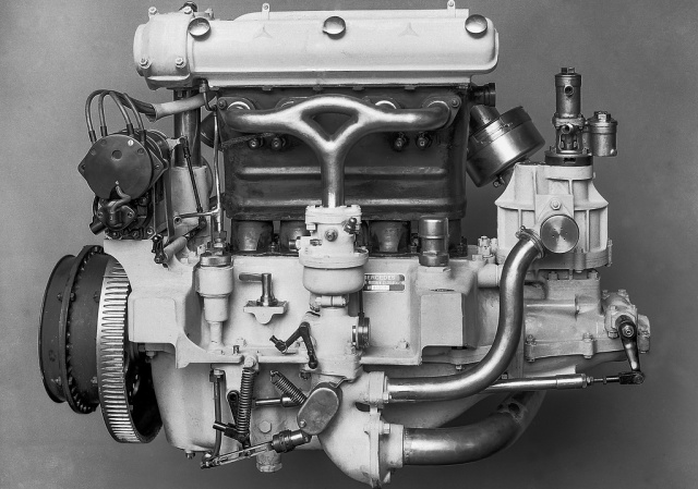 Motor des Mercedes 6/40/65 PS. Dieser erste 1,5-Liter-Vierzylinder-Rennmotor mit Kompressor (im Bild rechts) hat bei dem Straßenrennen in Sizilien Premiere. Er leistet 49 kW (79 PS) mit zugeschaltetem mechanischem Lader.