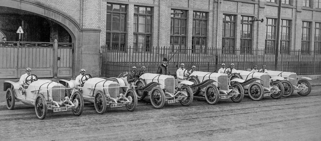 Foto der Mercedes-Rennwagen am Werk Untertürkheim vor der Abfahrt nach Sizilien. Von links: Mercedes 6/40/65 PS (am Steuer vermutlich Jakob Krauss), Mercedes 6/40/65 PS (am Steuer Paul Scheef), Mercedes 115 PS Grand-Prix-Rennwagen (am Steuer Christian Lautenschlager), Mercedes 28/95 PS mit Kompressor (am Steuer Max Sailer), Mercedes 28/95 PS ohne Kompressor (am Steuer Christian Werner) und Mercedes 115 PS Grand-Prix-Rennwagen (am Steuer Otto Salzer).