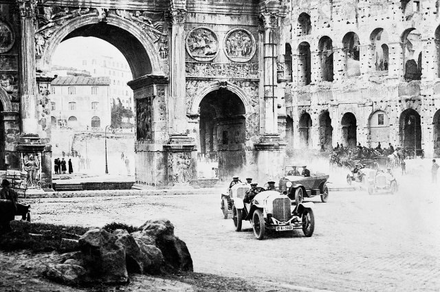 Fahrt der Mercedes-Rennwagen durch Rom bei der Anreise nach Sizilien auf eigener Achse. Vorn Otto Salzer mit seinem Mercedes 115 PS Grand-Prix-Rennwagen.