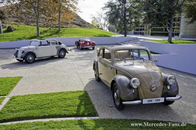 Im Bild: Mercedes-Benz 170 H, Baureihe W 28, 1936 bis 1939, Mercedes-Benz 130, Baureihe W 23, 1934 bis 1936 und Mercedes-Benz 150 Sport-Roadster, Baureihe W 30, 1934 bis 1936 (von vorne nach hinten).