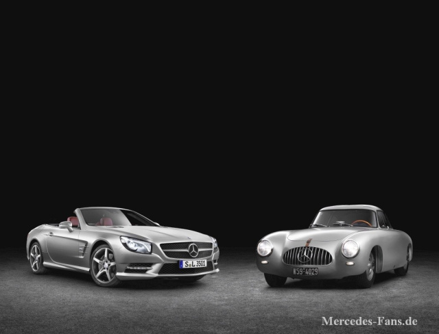 Mercedes-Benz 350 SL (R 231, ab 2012) der erste fast vollständig aus Aluminium gefertigte SL. Noch vor der Europa-Markteinführung am 31. März 2012 ist er auf der TECHNO-CLASSICA zu sehen. Er schlägt die Brücke von der Klassik zur Moderne knüpft er doch mit seiner Leichtmetallkarosserie an den ersten 300 SL an, der in einer Sonderausführung in 29 Exemplaren eine Alu-Karosserie über dem Stahl-Gitterrohrrahmen trug. Der neue R 231 dokumentiert noch konsequenteren Leichtbau: Bei ihm ist auch das tragende Gerüst aus Alu gefertigt. Fein ausgearbeitete Details, ein markantes Heck sowie Belüftungsgitter mit verchromten Finnen aus dem Formenschatz von Mercedes-Benz unterstreichen die Zugehörigkeit zum Mythos SL.