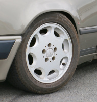 Um die angesprochene Leistung im Zaum zu halten, verbaute man seinerzeit u.a. eine Vierkolbenbremsanlage mit 300x28 mm Scheiben vorne. Diese "verstecken" sich hinter Leichtmetallfelgen in 7x16" mit 225/50 R16er Reifen in etwas ausgestellten Radhäusern.