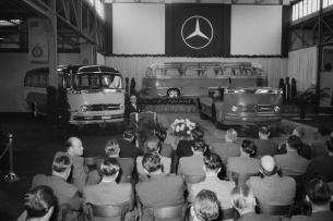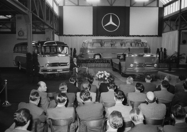 Heimat der Omnibusse: Bild eines Presseempfangs anlässlich der Vorstellung des Mercedes-Benz Typ O 321 H am 6. Dezember 1954 in Mannheim.