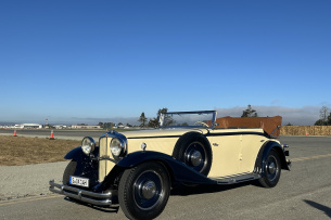 Doch rollt der Luxuskoloss erst einmal am benachbarten Golfplatz vorbei, an dem Männerrunden die morgendliche Abschlagzeit zelebrieren, zeigt der Maybach DS8 mit Cabrioletkarosserie, was Komfort in den frühen 1930er Jahren bedeutete. Einfach über den Drehregler am mächtigen Steuer den zweiten Gang vorgewählt, kurz vom Gas gegangen und die nächste Schaltstufe kuppelt sich wie von Geisterhand ein, während der offene Koloss sich mit seinem sonoren V12 Sonne und Fahrwind entgegenstemmt, während nebenan ein Hubschrauber startet und sich der Morgennebel erhebt. Das knarzende Leder der grandios verarbeiteten Sitze, der Blick auf die verchromte Uhrenbatterie und der Wind, der durch die abgesenkten Seitenscheiben den Innenraum durchzieht – grandios. Der DS8 wird schneller, der Hebel am Steuer wird nach oben gedreht, kurz vom Gas und zack. Mehr als ein Hauch Automatikgetriebe, das sich erst Jahrzehnte später durchsetzte. Die Gangwechsel klappen bei den nächsten Versuchen herauf wie herunter mit etwas Zwischengas problemlos. Automobiler Luxus in den turbulenten 1930er Jahren – typisch Maybach.