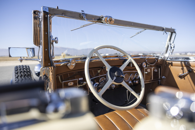 Bereits sein Antrieb ließ selbst verwöhntestes Klientel von der großen Reise träumen. Unter der Haube säuselt verträumt ein acht Liter großes V12-Triebwerk mit 147 kW / 200 PS. Heute nichts Besonderes, doch in einer Ära, in der nur wenige Menschen überhaupt ein Auto besaßen und diese Fahrzeuge für den Vortrieb selten mehr als zur Verfügung 40 PS hatten, ist das ein Ansage, die auch heute noch eindrucksvoll nachhallt. Noch spektakulärer als der Vortrieb bis zu einer Geschwindigkeit von 160 km/h ist jedoch das sogenannte Schnellganggetriebe, bei der nur der erste Gang per linkem Fuß eingekuppelt werden muss. Die weiteren Fahrstufen werden am wollweißen Lenkrad vorgewählt und der Zeppelin DS8 macht die Arbeit per Unterdruck von selbst. Wie entspannt das seinerzeit war, lässt sich unter der warmen kalifornischen Sonne von Salinas auch heute noch eindrucksvoll erfahren. Als ob der lederne Luxus im Innenraum des DS8-Cabriolets nicht schon spektakulär genug wäre, gewöhnt man sich an das entspannte Reisen in der über 5,30 Meter langen Sonnenterasse bereits nach wenigen Augenblicken und genießt die Zeitreise trotz der kühlen 13 Grad Celsius. Starten mit einem kurzen Gasstoß und losgefahren – ganz normal per Kupplung und Schaltung.