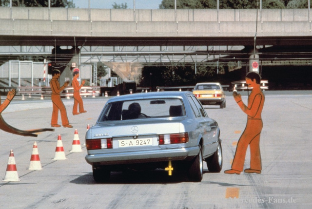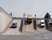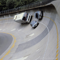 Das gesamte Netz der Untertürkheimer Versuchs- und Teststrecken auf dem 8,4 Hektar großen Areal ist 15 460 Meter lang, gespickt mit Radar-Messpunkten und Mess-Elektronik, und es enthält Teilstrecken für Brems- und Beschleunigungsversuche auf unterschiedlichen Fahrbahnbelägen mit vielfältigen Schwierigkeitsgraden zum Teil auch unter Wasser gesetzt, um den Reibwert zwischen Rad und Fahrbahn zu vermindern. Diese Folterstrecken beanspruchen Personenwagen und Nutzfahrzeuge immens. Doch nur so werden Schwachpunkte erkannt und können vor der Serienfertigung ausgemerzt werden. Das weiß auch der Fahrer der schwarzen Limousine. Mit großer Gewissenhaftigkeit dreht er Runde um Runde, immer wieder in die Steilkurve hinein. Für ihn ist die spektakuläre Fahrt Routine.