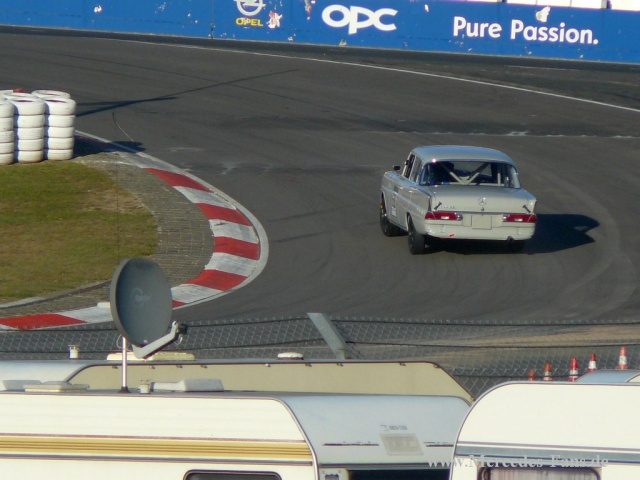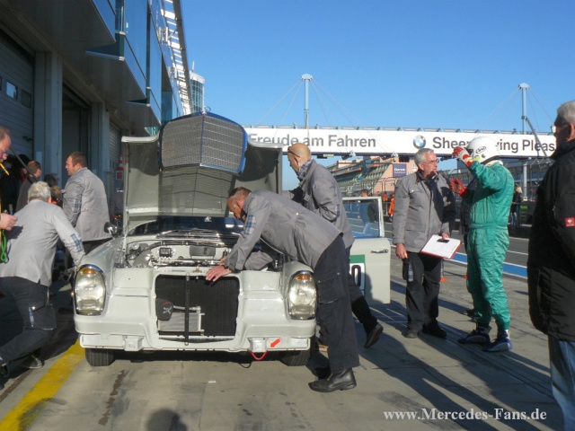 Weiter geht´s realistisch: "Mit 138 PS unter der Haube kann man, und das wissen wir alle, bei einem FHR Rennen kaum vorn mit halten, mag das Auto auch früher noch so erfolgreich gewesen sein. Bei einem Rennen wie dem heutigen, in dem es außer Hubraumklassen keine weiteren Unterteilungen gibt, müssen wir uns darüber klar sein, dass wir der Spitze, die im Prinzip von unserem "Nachbarn" aus Zuffenhausen beherrscht wird, klar unterlegen sind. Für uns ist heute wichtig, dass das Auto im Rennen durchhält. So möchten wir den Grundstein dafür legen, auch im nächsten Jahr, also 50 Jahre nach der Europameisterschaft Eugen Böhringers, in vier bis sechs Rennen die Erinnerung hieran und an Mercedes-Benz als ein Haus der Tradition wach zu halten. Wir hoffen, dass uns dabei neben Klaus Ludwig weitere aus früheren Jahren bekannte Piloten unterstützen werden."