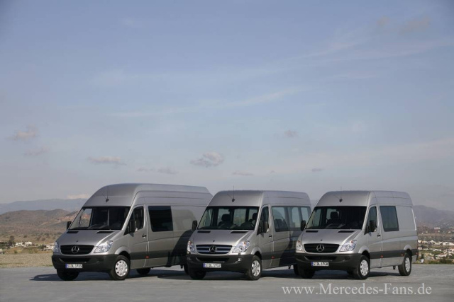 Neues Spitzentriebwerk unter den Dieseln ist ein V6-Zylinder mit 3,0 Liter Hubraum, 135 kW und 400 Nm max. Drehmoment. Alle Dieselmotoren sind schadstoffarm nach Euro 4 bzw. EU 4/III und verfügen serienmäßig über einen Partikelfilter. Eine neue Leistungsdimension für Transporter eröffnet im Sprinter der V6-Benzinmotor M 272: 190 kW aus 3,5 Liter Hubraum sprengen alle bisherigen Maßstäbe. Die Kraftübertragung auf die Hinterachse übernimmt ein Fünfgang-Automatikgetriebe. Es ist auf Wunsch auch für die Dieselmotoren lieferbar. Diese sind serienmäßig mit einem Sechsgang-Schaltgetriebe mit Joystick-Schaltung im Armaturenbrett gekoppelt. Bis zu drei wählbare Achsübersetzungen pro Modell erlauben eine feinstufige Anpassung des Sprinter an die jeweiligen Anforderungen.