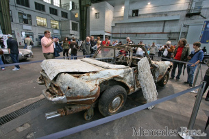 Pagoden gab es beim Mercedes-Treffen Mercedes-Benz & Friends viele, aber keine war wie diese. Hingestellt oder besser gesagt aufgebahrt in einem Hangar, in dem sich mehrere Clubs befanden, u.a. auch der Mercedes-Benz SL Club Pagode. Ein merkwürdig zerknüllter und perforierter Blechhaufen zog da die Umstehenden in ihren Bann. Ein genauerer Blick bestätigte: das ist oder besser gesagt das war einmal eine Pagode. Eine weiße offensichtlich. Der Blick auf die Kofferraumklappe führt zu einem überraschenden Resultat: dort findet sich tatsächlich noch das Typenschild. Ein 230 SL versank vor ungefähr 30 Jahren in den Fluten des Neckar. Und das, was dort in Berlin zu sehen war, waren dessen Überreste.