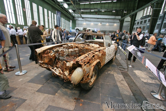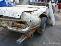 Michael Lenhardt, seines Zeichens der besagte Technik-Referent des Mercedes-Benz SL Club Pagode kann den bemerkenswerten Schrotthaufen dagegen schon sehr plausibel erläutern: "Sie können heute jedes Auto restaurieren. Und es hat auch schon mal jemand Interesse bekundet, genau dies mit unserer Wasserleiche zu tun. Aber dann ist diese Pagode eine Pagode wie jede andere und das wollen wir eigentlich nicht. Also bleibt Sie erst einmal wie sie ist. Einzigartig ist sie in der Tat und ihre Herkunft völlig ungeklärt.