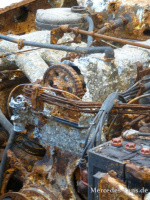 Und diese sind je nach Blickwinkel einfach nur mitleidserregend erbärmlich, oder faszinierend oder in Teilen sogar überraschend gut erhalten. Wir z.B. die Endrohre des Auspuffs oder auch der Tankverschluss. Selbst die Stoßstangen sehen nicht schlechter als bei manchem Scheunenfund aus (Wobei man dort bekanntlich oft auch das Gefühl hat, der Finder habe seinen Scheunenfund eher in einem Teich gefunden!) Aber weder die Blechteile, noch die Technik lassen sich sinnvollerweise an einer anderen Pagode weiterverwenden. So haben die Substanzen im Neckar auch da war und ist ja bekanntlich nicht immer nur Wasser drin den Zylinderkopfdeckel durchgefressen und das Stirnrad freigelegt. Die Scheiben sind komplett verschwunden.
