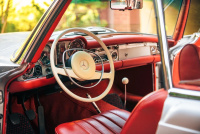 Während einer kürzlich durchgeführten Restauration erhielt der Roadster eine Auffrischung in Sachen Lack und Interieur. So strahlt die Pagode wieder in dem korrekten Mercedes Silver und dazu passender, roter Polsterung, die allerdings von dem originalen MB-Tex Material zu einer Komplett-Lederausstattung in Mercedes Qualität gewechselt wurde. Das Stoffdach blieb original und natürlich gibt es auch das originale Pagoden Harttopdach. Das ebenfalls originale Becker Radio wurde generalüberholt und funktioniert wieder einwandfrei.