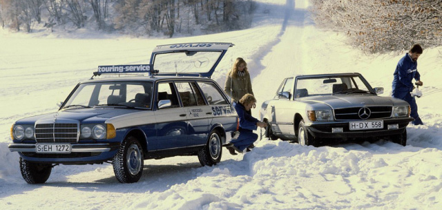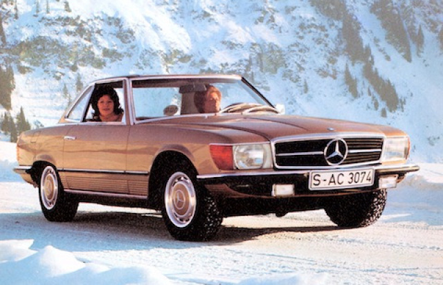 Die beiden Damen auf diesen Foto machen wohl einen Roadtrip durch die Alpen. Als Transportmittel dient dazu ein C107. Für das sportlich, elegante Coupé haben sich die Damen sicher nicht ohne Grund entschieden: Bei der Südamerika-Rallye 1978 landete der SLC bei seinem Debut einen Fünffach-Sieg. Im Jahr darauf starteten vier SLC-Modelle bei der Bandama-Rallye an der Elfenbeinküste. Von insgesamt 62 Startern kamen nur neun über die Ziellinie – darunter auch die vier SLC-Modelle. Das Besondere: Alle vier Sterne belegten die Plätze 1 bis 4.