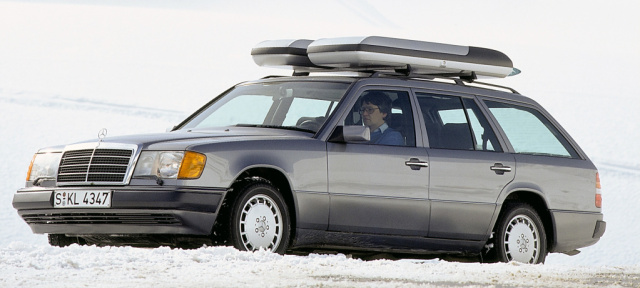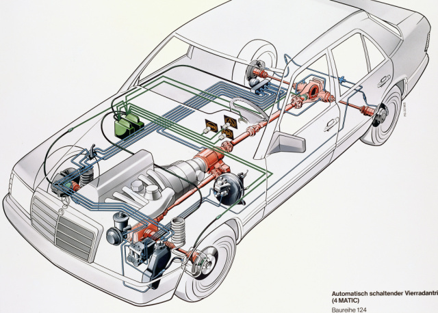 Zum Blickfang auf der Ausstellungsfläche von Mercedes-Benz bei der IAA 1985 wird das neue T-Modell (Baureihe S 124). Beim Blick auf das Heck eines 300 TE fällt die Bezeichnung „4 MATIC“ auf. Sie weist auf das neu entwickelte Traktionssystem hin, das in den Sechszylindermodellen der Baureihe 124 Premiere feiert. Die 4MATIC schaltet den Vorderradantrieb und die Differenzialsperren gezielt in Situationen zu, in denen der normale Antrieb der Hinterachse nicht ausreicht. So etwa auf Schnee oder Eis, nassem oder losem Untergrund. Kernstück der 4MATIC ist ein einstufiges Verteilergetriebe mit offenem Zentraldifferenzial, das den Drehzahlausgleich zwischen den Achsen übernimmt. Es ist direkt mit dem Automatikgetriebe verbunden und bildet zusammen mit Motor, Drehmomentwandler und Vorderachsantrieb eine komplette Antriebseinheit.