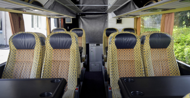 Im Unterdeck des S 328 DT befindet sich eine Bordküche mit Würstchenkocher, Heißwasserboiler und Mikrowelle sowie eine Toilette. Die Passagiere konnten es sich hier auf ihren Reisen durch ganz Europa an vier Clubtischen bequem machen. Die insgesamt 72 Stoffsitze haben Lederkopfteile integriert. Das am weitesten entfernte Reiseziel war Portugal. Für die Familie Dysli ist die Übergabe ein ganz besonderer Moment: „Wir freuen uns sehr, dass unser S 328 DT in der Setra Oldtimer Sammlung einen Platz für sein nun ewiges Leben inmitten weiterer exklusiver Klassiker der Marke haben wird.“