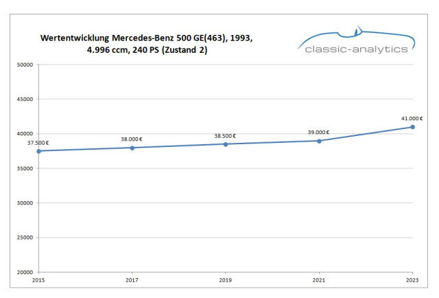 So steht´s um den Mercedes-Benz 500 GE V8: Marktanalyst Classic-Analytics präsentiert die Wertentwicklung zum 1993er Modell in Zustandsnote 2.