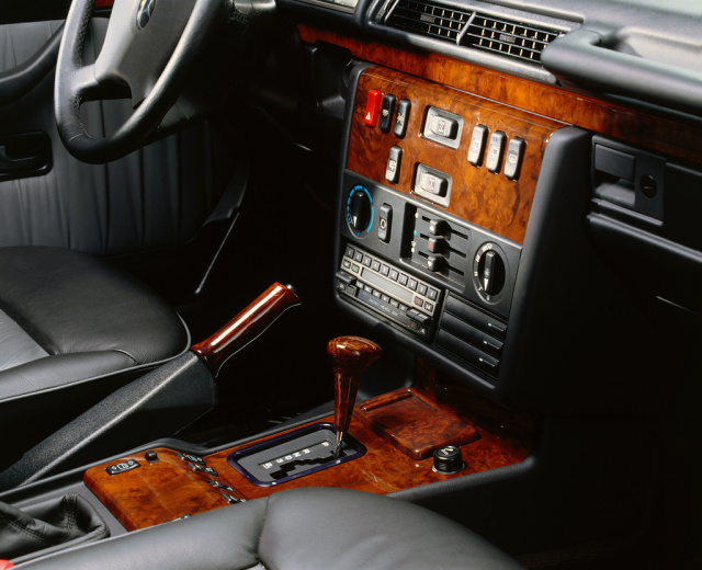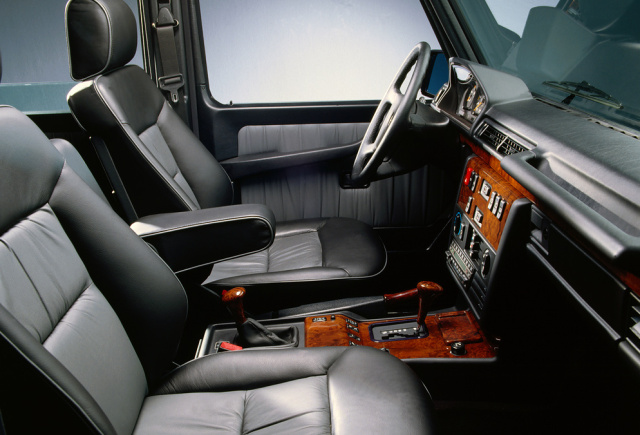 Umfangreich ist die Serienausstattung des 500 GE V8, dessen Interieur neu gestaltet ist. Eine schwarze Lederausstattung mit Kontrastelementen gehört dazu: Sitz- und Lehnenkissen, die Sitzeinfassungen und die Türverkleidungen sind in Mittelgrau abgesetzt. Mit Walnussfurnier versehen sind die Holzauskleidung der Mittelkonsole, Teile des Handbremshebels, der beiden Getriebewählhebel sowie Zierelemente an den Türen. Eine amethystblaue Metallic-Sonderlackierung schließt die Stoßfänger, Kotflügelverbreiterungen und Spiegelgehäuse mit ein. Automatikgetriebe, Klimaanlage, Tempomat, ein elektrisches Schiebe-Hebedach, Lederlenkrad und eine Sitzheizung sind stets an Bord. Die Exklusivität und Ausstattung hat ihren Preis: Er beträgt 178.250 DM. Zwei Vergleichswerte: Ein G 320 mit Sechszylindermotor kostet damals 88.500 DM. Eine S-Klasse vom Typ 500 SE der Baureihe 140 mit Motor M 119 ist für 129.030 Mark zu haben.