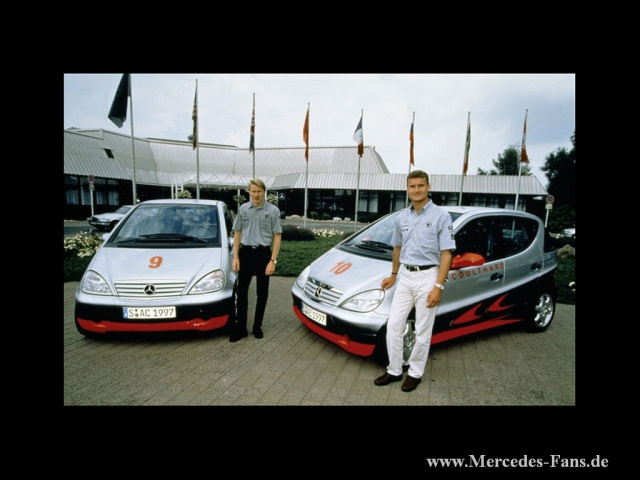 Mercedes-Benz feiert 1998 den Sieg der der Formel-1-Weltmeisterschaft. Zur Essen Motor Show stellen die Stuttgarter im November 1988 eine besondere A-Klasse in zwei Varianten vor: die Edition Häkkinen und die Edition Coulthard. Mika Häkkinen wurde mit Mc-Laren-Mercedes zwei Mal hintereinander Formel 1 Weltmeister (1998 und 1999) . David Coulthard wurde 2001 Vizeweltmeister. Auch er startete für Mc-Laren-Mercedes in der Formel1. Zu Ehren der Formel-1-Piloten Mika Häkkinen und David Coulthard wird diese Sonderausführung in jeweils 125 Exemplaren gebaut.