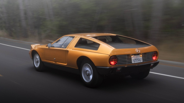 Morgens um kurz nach sieben Uhr auf einem kleinen Flugplatz nahe Salinas (USA), 20 Minuten von Monterey entfernt. Gerade startet auf dem Flugplatz mit der offizielle IATA-Kennung SNS eine der zahlreichen hier beheimateten Privatmaschinen, am benachbarten Golfplatz wird an Loch sieben von den grauhaarigen Early Birds ins leichte Rough abgeschlagen und der hier stationierte Rettungshubschrauber lässt munter seinen Rotor warmlaufen. Es sieht nach einem ganz normalen Sommermorgen an der kalifornischen Pazifikküste aus. Doch auf der Nebenstartbahn ganz im Süden des Airfields sorgt ein orangefarbener Sportwagen aus den 1970er Jahren für deutlich mehr Interesse als jeder Steigflug. Die Golfspieler glotzen sich nach dem weißherbst-farbenen Flügeltürer die Augen aus, als sie mit ihren Golfcarts herüber zum nächsten Abschlag zuckeln und die Flughafenaufsicht hat das Pick-Up-Frühstück in Blickweite der Südpiste verlegt. Doch das Autodesign mit abgefahrenen Proportionen, aufgeschlagenen Klappscheinwerfern und selbst die weit aufgeschlagenen Flügeltüren sind nicht das wirklich spektakuläre an diesem Mercedes C 111.