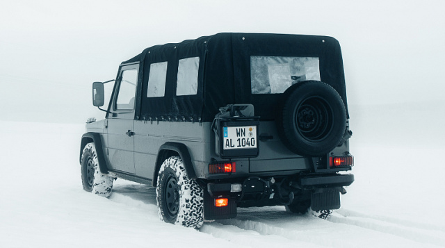 Richtungswechsel werden dabei stilvoll mit dem neuen Holzvolant vorgenommen. Natürlich hat es Lorinser Classic nicht bei „inneren Werten“ belassen, was schon ein Blick auf die makellose Karosserie zeigt. Sie wurde inklusive der Scheinwerfereinfassungen in Arabergraumatt lackiert und trägt ein komplett neues Verdeck in schwarzem Stoff. Vom Unterboden tilgte der Trockeneisstrahl alle Manöverspuren, anschließend wurde er dauerhaft konserviert. Schließlich ist der Prachtkerl von einem Geländewagen erst 110.000 Kilometer gelaufen und der Motor wie vieles andere nach der Überholung so gut wie neu. Ein kleines, aber stilvolles Modernisierungsprogramm gab es für das ehemalige Armeegefährt überdies. Die Mechaniker installierten neben LED-Hauptscheinwerfern mit Schutzgittern eine Anhängerkupplung, die stolze 3,5 Tonnen an den Haken nehmen darf. Spur-und Kotflügelverbreiterungen in Kombination mit 16-Zoll-Offroad-Stahlfelgen von DOTZ 4x4 sorgen für einen satten Stand auf der Straße. Dazu gibt es All-Terrain-Bereifung von BF Goodrich.