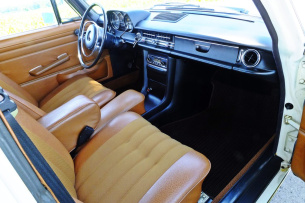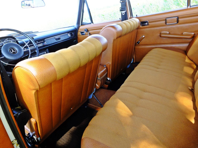 Keine Frage, Gärtnermeister Luhmann hat mit seinem Mercedes-Fund einen guten Schnitt gemacht. Wunderschön und geradezu makellos präsentiert sich die komplette cognacfarbene Innenausstattung des 71er W115. Fleckiger, vergilbter Himmel? Nein! Durchgesessene Polster und abgeschubbelte Sitzbezüge? Denkste! Abgenutzt wirkende Bedienelemente und Türverkleidungen? Fehlanzeige. Fast wie neu ist der Eindruck des Innenraums, der nach wie vor in der damals so beliebten Buchhalterausstattung (ohne Extras) konfiguriert ist.