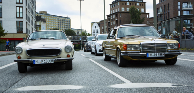 Unsere Foto-Session startet wenige Tage später bereits auf dem Weg zur Location. Im Doppelpack fahren wir mit der S-Klasse und einem Volvo P1800 ES durch Hamburg. Das ungleiche Duo zieht neugierige Blicke auf sich: Zwei Urgesteine der Automobil-Geschichte – wir haben jede Menge Spaß. Angekommen auf der Hamburger Schanze erzählt Halil von seiner Beziehung zu Autos: „Als ich ein kleiner Junge war, fuhr mein Vater auch eine S-Klasse. In der Türkei gibt es davon unglaublich viele, noch heute.“ Halils Vater arbeitete als Busunternehmer und brachte seinem Sohn schon früh die Vorzüge motorisierter Mobilität bei. Heute ist es Halil selbst, der seine eigenen Kinder im Klassiker durch die Gegend fährt: „Meine Frau und die Kinder lieben das Auto“, erzählt der heute 37-Jährige. Lachend schiebt er hinterer: „Aber damit in die Türkei fahren, wollen sie nicht. Das ist ihnen zu weit. Ich würde das ja sofort machen!“