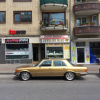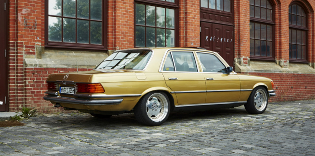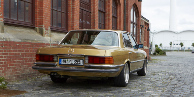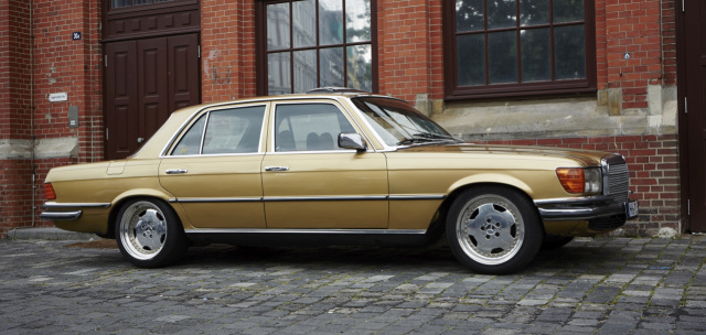Wer sich für Oldtimer begeistert, hat auf der Straße stets ein wachsames Auge für betagtes Blech. Im stockenden Verkehr auf der Hamburger Hoheluftchaussee fällt mein Blick auf eine S-Klasse: goldig glänzender Lack, Tieferlegung, polierte AMG-Felgen – zugegebener Maßen auf den ersten Blick dezent prollig wirkend. Obendrein parkt der Benz direkt vor einem Fachgeschäft für An- und Verkauf von Gold. Zufall? Oder konsequentes Marketing? Auf jeden Fall spannend. Also rasch rechts rangefahren, ausgestiegen und mit dem Smartphone ein Beweisbild geschossen.