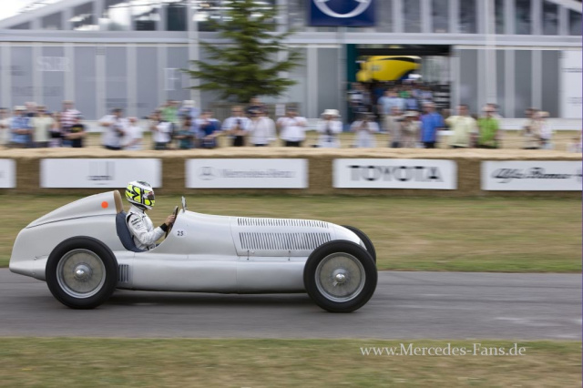 Mercedes-Benz hatte anlässlich des 75-jährigen Jubiläums der Silberpfeile eine respaktable Kollektion an legendären Motorsport-Klassikern über den Kanal geschippert. Neben dem W 25, den Manfred von Brauchitsch beim Eifelrennen 1934 pilotierte, zeigten die Schwaben auch einen W125 von 1937, einen W165 von 1939 und zwei der sagenhaften W196 von 1954, den in Stromlinien-Variante erstaunlicherweise auch heute noch fast jedes Kind kennt und als Mercedes identifiziert. Ebenfalls in Godwood dabei der McLaren-Mercedes MP4-23, mit dem Lewis Hamilton 2008 Weltmeister wurde, sowie der Mercedes-Benz SLR McLaren Stirling Moss, der von Moss selbst gesteuert wurde.