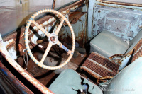 Unser hier präsentiertes Modell hatte bereits vor langer Zeit ausgedient und stand lediglich als Wegweiser an der Nebenstraße. Was äußerlich einen Oldtimer erahnen ließ, bestätigte sich bei einem Blick z.B. auf die Pritsche, bzw. besser ausgesprochen, bei einem vergammelten Durchblick auf die Pritsche bis zur Hinterachse ganz und gar nicht. Durch das geöffnete Fenster auf der Fahrerseite riskierten wir einen kurzen Ausflug in die Fahrerkabine, Sauna-Temperaturen ließen grüßen.