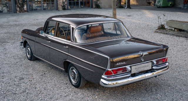 Bei der Heckflosse zeigt das Baureihenmuster von Mercedes-Benz was es drauf hat. So unterteilt der Mercedes-Fan nicht nur in W110 "kleine Heckflosse", sondern innerhalb der "großen Heckflosse" jeweils auch nochmal in kleine (W111: 220 b - 230 S - 280 SE) und große Heckflosse (W112: 300 SE). Für die schnelle Identifizierung genügt der Blick auf die Scheinwerfer. Sind sie rund, ist es die Baureihe W110, sind die aber länglich stehend angeordnet, handelt es sich um eine große Flosse. Das verrät uns in diesem Falle schonmal, dass es sich bei diesem Exemplar um eine große Heckflosse handelt. Die Heckflosse 220 Sb der Baureihe W111 steht aktuell in Polling bei HK-Engineering zum Verkauf.