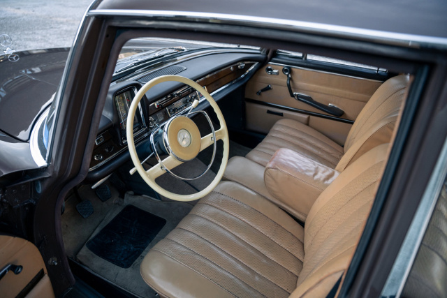 Die Kombination aus Tabakbraun mit beigem Leder lässt den 220 Sb elegant und zeitlos erscheinen. Laut HK-Engineering soll sich das komplette Interieur noch im Originalzustand befinden. Die Bremsanlage der Flosse wurde soeben erst erneuert.