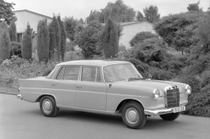 Als die neue Mercedes-Generation 1959 das Licht der Welt erblickte, hatte sie freilich viel mehr zu bieten, als nur ein auffällig gestyltes Heck. Gerade in Sachen Sicherheit brachten die zunächst als 220b, 220 Sb und 220 SEb erhältlichen Wagen der Baureihe W 111 viele Innovationen auf die Straße. So zum Beispiel die von Knautschzonen an Front und Heck geschützte Fahrgastzelle, das gepolsterte Armaturenbrett oder die ebenfalls gepolsterte Lenkradnabe.
