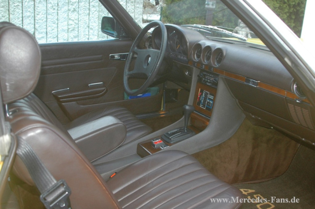 Die USA Version des 450 SL von 1980 verfügt über einen geregelten Katalysator, Tempomat und Klimaanlage. Leider sind von den für den 450er üblichen 224 PS in der Kat Version nur noch 190 PS übriggeblieben: Trotzdem macht die Fahrt auf Jennifers Sitz enorm viel Spaß."Für das Cruisen ist der V8 einfach Klasse und die weiche Federung macht ihn zum extrem komforttablen Gleiter", berichtet Jörg.