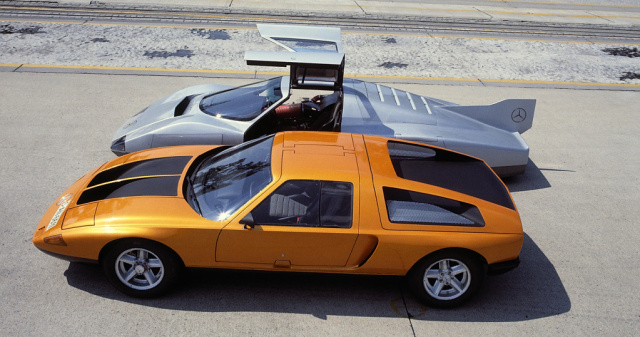 Mercedes-Benz Rekordwagen C 111-III, 5-Zylinder-Turbodiesel, (unten) C 111-II mit 4-Scheiben- Wankelmotor, auf der Einfahrbahn in Untertürkheim.