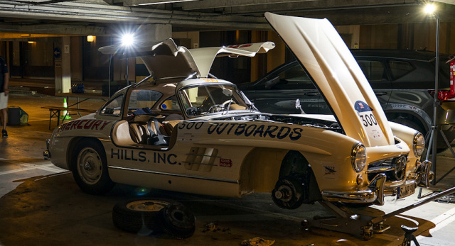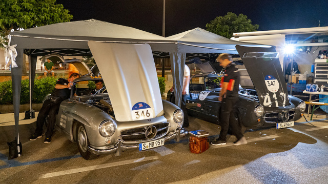 Mercedes ist zum dem Großereignis gleich mit mehreren Werkstattteams angereist, weil eine ganze Reihe von Fahrzeugen im Mille-Miglia-Feld den Stern auf der Haube tragen und bei so einem Oldtimerrennen gibt es für alle mehr als genug zu tun. Dabei beginnt die Mille Miglia alljährlich nicht an einem Mittwochmittag in Mai oder Juni, sondern einige Wochen oder gar Monate vorher, denn bereits lange vor dem Start gibt es einiges zu tun. „Die Temperaturen werden dieses Mal besonders hoch“, erläutert Mechaniker Andreas Häberle, „wir haben daher kleine Gummischläuche auf den Schließmechanismus der Motorhaube vom Flügeltürer geklemmt. So kann die Motorwärme besser abziehen, denn die Zündung kann bei 110 Grad Celsius schon einmal Probleme machen – gerade wenn die Fahrzeuge in den Ortschaften stehen.“ Der grauhaarige Monteur ist ein alter Mille-Fuchs und hat schon 16 Veranstaltungen quer durch das Land von Pasta und Pizza mitgemacht. „Natürlich ist man bei einer Veranstaltung wie der Mille Miglia angespannt. Es kann viel passieren und man weiß nie, was auf einen zukommen kann“, erzählt Andreas Häberle, „viel Schlaf gibt es sowieso nicht. Nach der Mille bin ich eine Woche platt.“ Häberle kennt die Mille Miglia wie nur wenige, doch während die breite Masse historische Renner wie Bugatti T40, Jaguar XK 120, Bentley 3,5 Litre oder eben die Mercedes 300 SL bewegt, ist der Mechaniker in einer wohl klimatisierten Mercedes V-Klasse unterwegs und muss diese allemal flott bewegen, um gerade bei den schnellen Überlandstrecken nicht den Anschluss zu verlieren.
