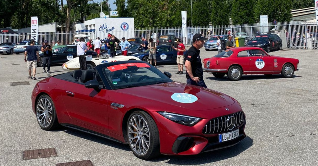 Zum allerersten Mal aber war aber auch eine Wertung für neuzeitliche AMG Fahrzeuge eingerichtet worden. Mercedes spielt von Anfang an eine starke Rolle bei der Mille Miglia, die in Brescia startet, nach Rom hetzt und in einer großen Schleife via Siena, Parma und Bergamo über Monza wieder zurück nach Brescia führt.