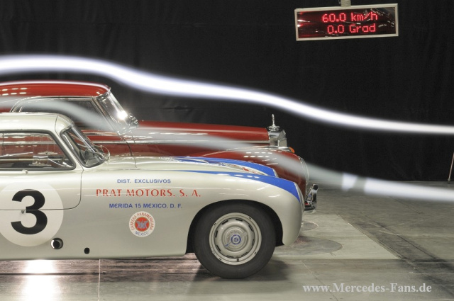 Der Morgen des 23. Januar 2012: Die drei Fahrzeuge stehen bereit. Die zu ihren Arbeitsplätzen eilenden Mitarbeiter des Mercedes-Benz Werks Untertürkheim ahnen nichts vom emsigen Betrieb hinter den Mauern des Windkanals. Acht Stunden wird der 5 Megawatt starke Elektromotor die Luftschaufeln der Turbine antreiben, um 9.000 Kubikmeter Luftvolumen in Bewegung zu setzen.Ziel ist festzustellen, in welcher Relation Flächen- und Luftwiderstandswerte der drei Probanden zueinander stehen sie sind technisch eng miteinander verwandt: Der W 194 basiert antriebstechnisch zu Teilen auf dem W 188 und der W 198 auf dem W 194. Die drei Fahrzeuge werden aus Gründen der unmittelbaren Vergleichbarkeit ohne Unterbodenverkleidungen gemessen. Ohnehin werden die drei Klassiker heutzutage im Straßenverkehr meist ohne Unterbodenverkleidung bewegt, um leichter an Servicepunkte zu kommen, und damit der Innenraum sich weniger aufheizt.