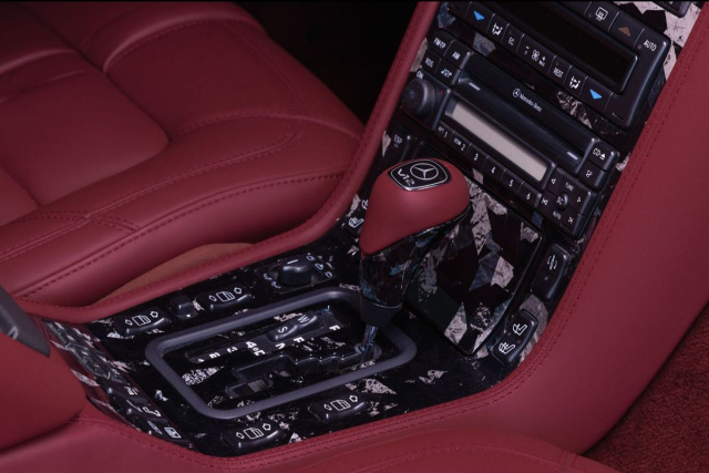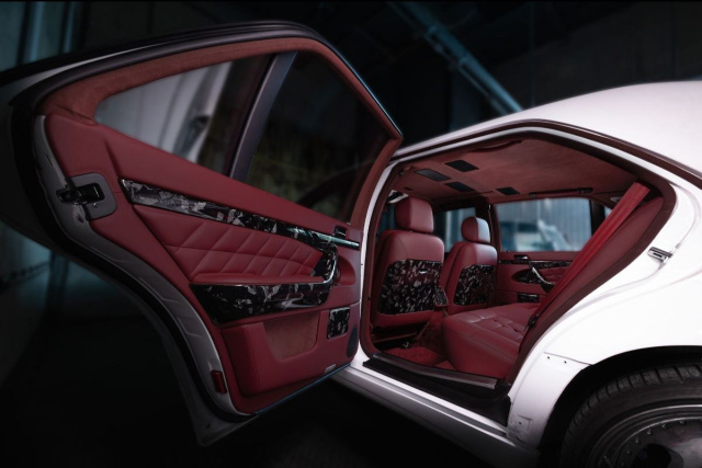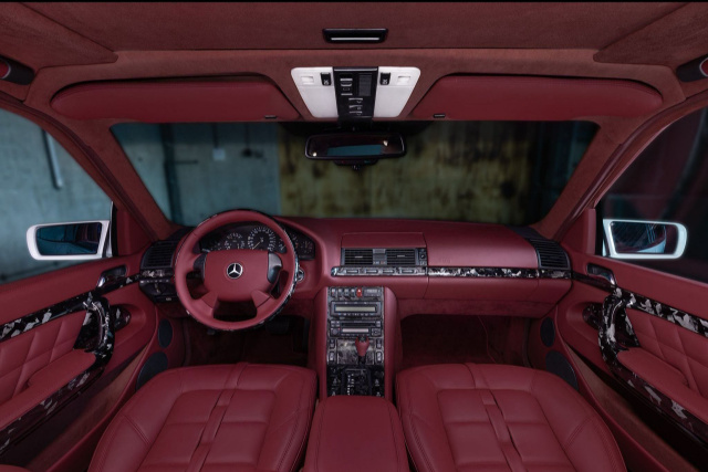 Armaturenbrett und Lenkrad wurden vollständig mit hochwertigem Leder veredelt und kommen mit einem markanten Look von Forged Carbon – einem Material, das moderne Dynamik mit der zeitlosen Formsprache des W140 vereinen soll. Dieses Material findet sich in Zierleisten, Lüftungsdüsen, Griffen und sogar auf den Rückseiten der Sitze wieder.