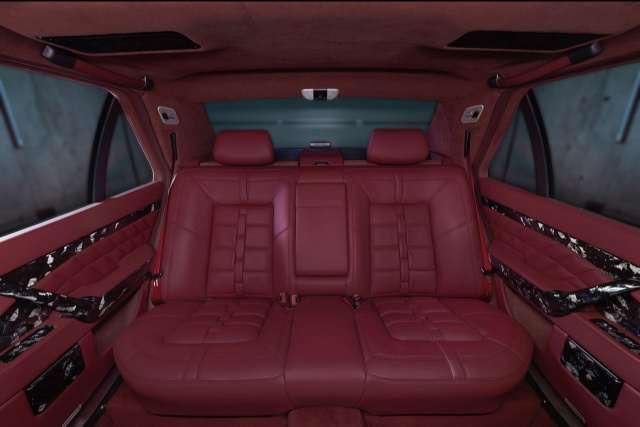 Der Innenraum wurde bis ins kleinste Detail mit feinstem Leder und Alcantara in einem edlen „Barn Red“ neu gestaltet – einem tiefen, warmen Rot-Ton, der eine besondere Atmosphäre aus Luxus und Wohlfühlatmosphäre schafft und zugleich den selbstbewussten, klassischen Auftritt der dicken S-Klasse bewahrt. Dachhimmel und Säulen sind mit rotem Alcantara bezogen, während Türgriffe und Sonnenblenden in Leder derselben Farbgebung gehalten sind.