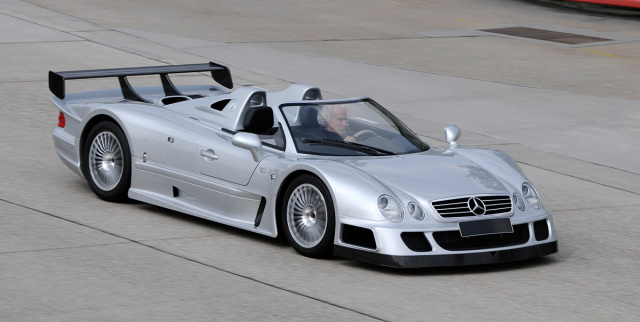Dieses 1954er Modell des Flügeltürers ist in einer Kleinserie von nur elf Fahrzeugen gebaut worden. Unter der fast original aussehenden Blechkarosse steckt der originalgetreue Rohrrahmen, aber u.a. auch ein M119 6,0 Liter-V8 mit 380 PS mit Mercedes-Benz W4A Vierstufen-Automatikgetriebe anstelle des originalen Reihensechszylinders. Eine der Veränderungen an dem Flügeltürer, die sofort ins Auge stechen sind die 17-AMG Leichtmetallräder im klassischen Fünf-Speichen-Design. Erst auf den zweiten Blick erkennt man die elektrisch verstellbaren Außenspiegel. Insgesamt elf 300 SL Modelle wurde von AMG zwischen 1996 und 2009 umgebaut, fünf Fahrzeuge gingen an die königliche Familie von Brunei, die sechs anderen an ausgesuchte AMG Kunden. AMG fertigte acht Coupés und vier Rechtslenker.1997 Mercedes-Benz CLK-GTR