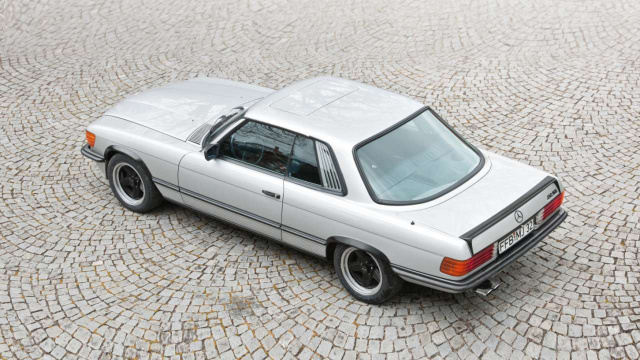 Von 1971-1985 bot AMG den Freunden des R/C 107 Roadsters und Coupés ein breit gefächertes Programm an Leistungssteigerungen und individuellen Ausstattungen an. Die Motoren-Palette reicht vom hochgepäppelten 2,8-l-Reihensechszylinder mit 210 PS bis hin zum 5,4-l- V8 mit 310 Pferdestärken. Darüberhinaus soll es für gut betuchte Kunden auch die Möglichkeit gegeben haben, den M100-Motor aus dem Mercedes 600, der ja auch in der AMG S-Klasse zum Einsatz kam, ebenfalls im Mercedes SLC zu ordern. Der so umgebaute 350 SLC firmierte als AMG 450 SLC 6.9 und wies 350 PS auf. Interessant an dem gezeigten Beispiel ist nicht nur die damals moderne sogenannte Shadowline, bei der die Chrompartien mattschwarz lackiert wurden. Sondern vor allem auch die ebenfalls mattschwarzen Felgen.