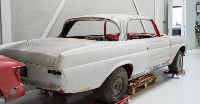 Auf dem Weg vom Lab in die Werkstatt/Showroom fallen uns ein roter SLC und ein abgeschliffener W111 auf. Neben dem ungewöhnlichen Anblick der leer geräumten Karossen fallen auf den ersten Blick wahllos verteilte kleine runde Sticker mit weißer Mitte und einer schwarzen Kontur auf. Roel erklärt, dass diese Sticker dazu dienen das Fahrzeug besser 3D Scannen zu können. So hat der Scanner gleich mehrere Fixpunkte an denen sich das Programm orientieren kann. So wird die Karosse letztendlich digitalisiert.