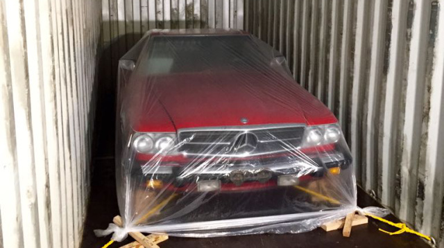 Der selbst-organisierte Schlepper-Service brachte das Auto auf dem Hänger dann zum „Shipping“. Genauer gesagt, wurde der SL in ein Industriegebiet gebracht, in dem die Schiffscontainer standen. Dort werden die Autos „verpackt“ und im Anschluss mit LKWs zu den Schiffen gebracht.