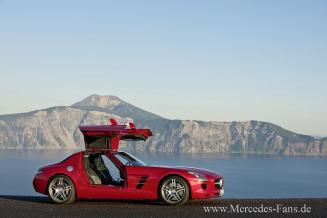 Das markante Design des neuen Supersportwagens Mercedes-Benz SLS AMG vermittelt spontane Faszination: durch die lange Motorhaube, das flache und weit hinten positionierte Passagierabteil und das kurze Heck mit ausfahrbarem Heckflügel. Die Flügeltüren liefern ebenso Reminiszenzen an die Sportwagen-Legende 300 SL wie der breite Kühlergrill mit dem Zentralstern und der flügelförmigen Querfinne sowie die Finnen auf der Motorhaube und den Fahrzeugflanken.
