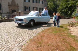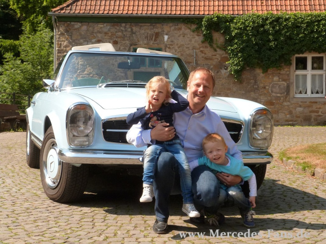 Schließlich bin ich, erzählt Matthias zum Schluß, hinsichtlich alter Sterne erblich vorbelastet. Mein Vater ist stolzer Besitzer eines 170 SV von 1953, ein Wagen, der mehrfach als bestrestauriertes Fahrzeug beim Jahrestreffen des Mercedes- Benz Veteranen Clubs ausgezeichnet wurde. Daneben bewegt er auch noch etwas Moderneres, nämlich einen 219 Ponton von 1957. Auch meinen kleinen Sohn schien neulich die Oldtimerei mit Stern bereits in Beschlag genommen zu haben als er in der offenen Pagode neben mir durch die Stadt fuhr und Passanten laut verkündete: Ich fahre Oldtimer!