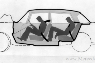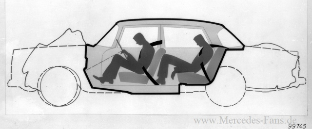 Der Daimler-Benz Ingenieur und Sicherheitspionier Barényi bricht bei dieser Entwicklung, die auf seinen früheren Prototypen und Patenten basiert, endgültig mit einer Konstante der Fahrzeugkonstruktion vergangener Jahrzehnte: Bisher galt stets eine möglichst steife Karosserie als beste Lösung, um Fahrer und Passagiere bei einem Unfall zu schützen. Dabei werden jedoch die durch den Aufprall entstehenden Kräfte kaum gedämpft an die Passagiere weitergegeben. Deshalb setzt Barényi nun auf die kontrollierte Deformation des Fahrzeugs an Front und Heck, um die bei einer Kollision entstehende Bewegungsenergie abzubauen. In der Mitte des Fahrzeugs birgt derweil eine gestaltfeste Sicherheitsfahrgastzelle die Passagiere und schützt sie vor Einwirkungen des Unfalls auf die Fahrzeugstruktur.