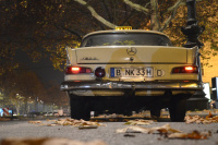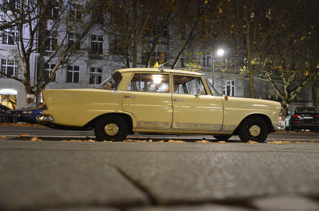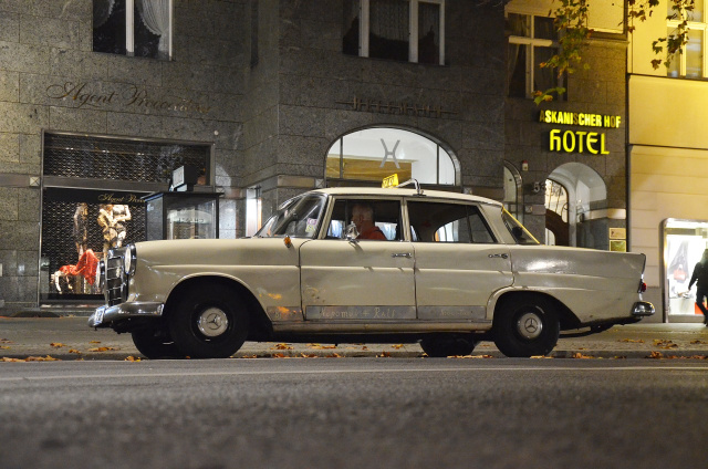 Über eine Million Kilometer hat Nepomuk jetzt runter. Seine Gebrauchsspuren verleihen ihm eine besondere Ästhetik und machen ihn erst richtig schön – ‘automobile Patina’ heißt das neudeutsch. Zum Taxi wurde die Heckflosse erst 1990 umgebaut und in RAL 1015 umlackiert. Unter der Motorhaube nagelt ein Austauschherz aus einem 123er. Die Fahrt geht über den Nollendorfplatz, über die bekannte Shopping-Meile Tauentzienstraße am KaDeWe vorbei zum Kurfürstendamm zur Kaiser-Wilhelm-Gedächtniskirche, dem östlichen Punkt des weltberühmten Boulevards, und weiter Richtung Rathenauplatz und dann zurück.